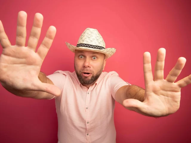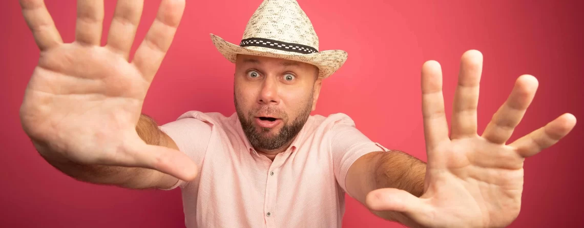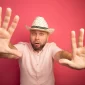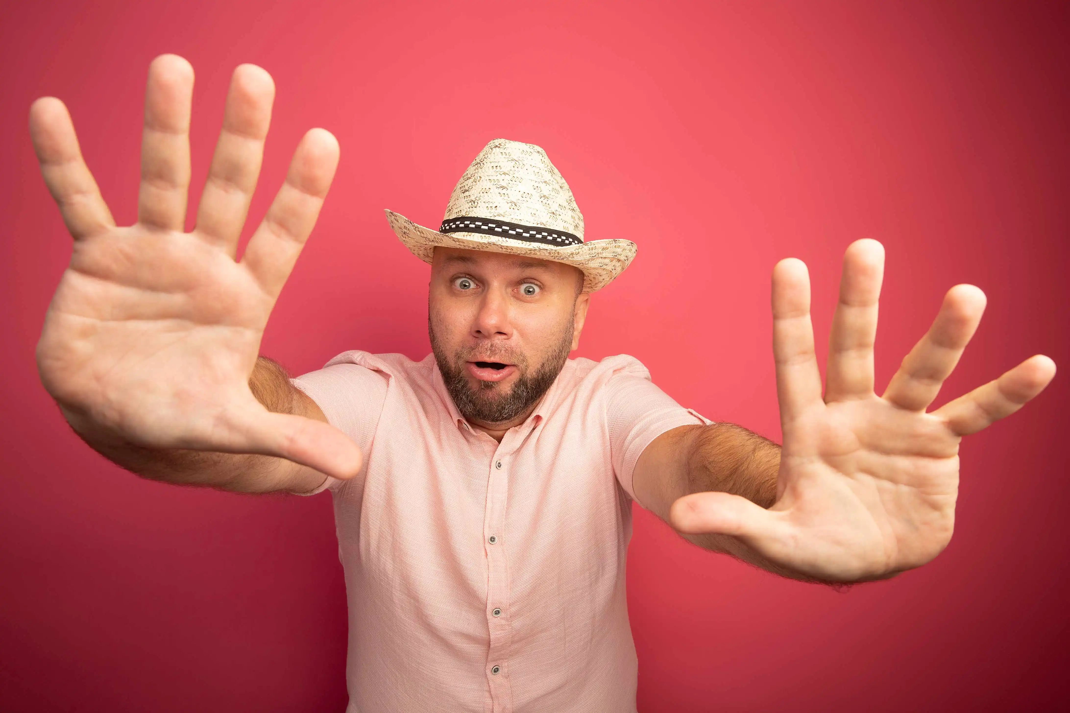 98855dc7-scared-middle-aged-bald-man-wearing-pink-t-shirt-hat-raising-hands-i...